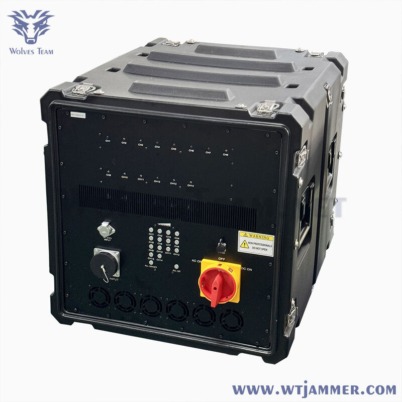 The Bomb jammer is a fully portable multi-band PLL or DDS Jamming system, housed in a ruggedized trolley type case for high mobility. It consists of more than 12 different jamming modules that can operate across more than 12 bands. This High Power Jammer with 12 bands jamming frequency modules can deliver up to 1200 Watt maximum output power. Installation and operation are straightforward, and the device can be powered by AC mains or a suitable DC power source. The system design complies with military requirements and international quality standards.